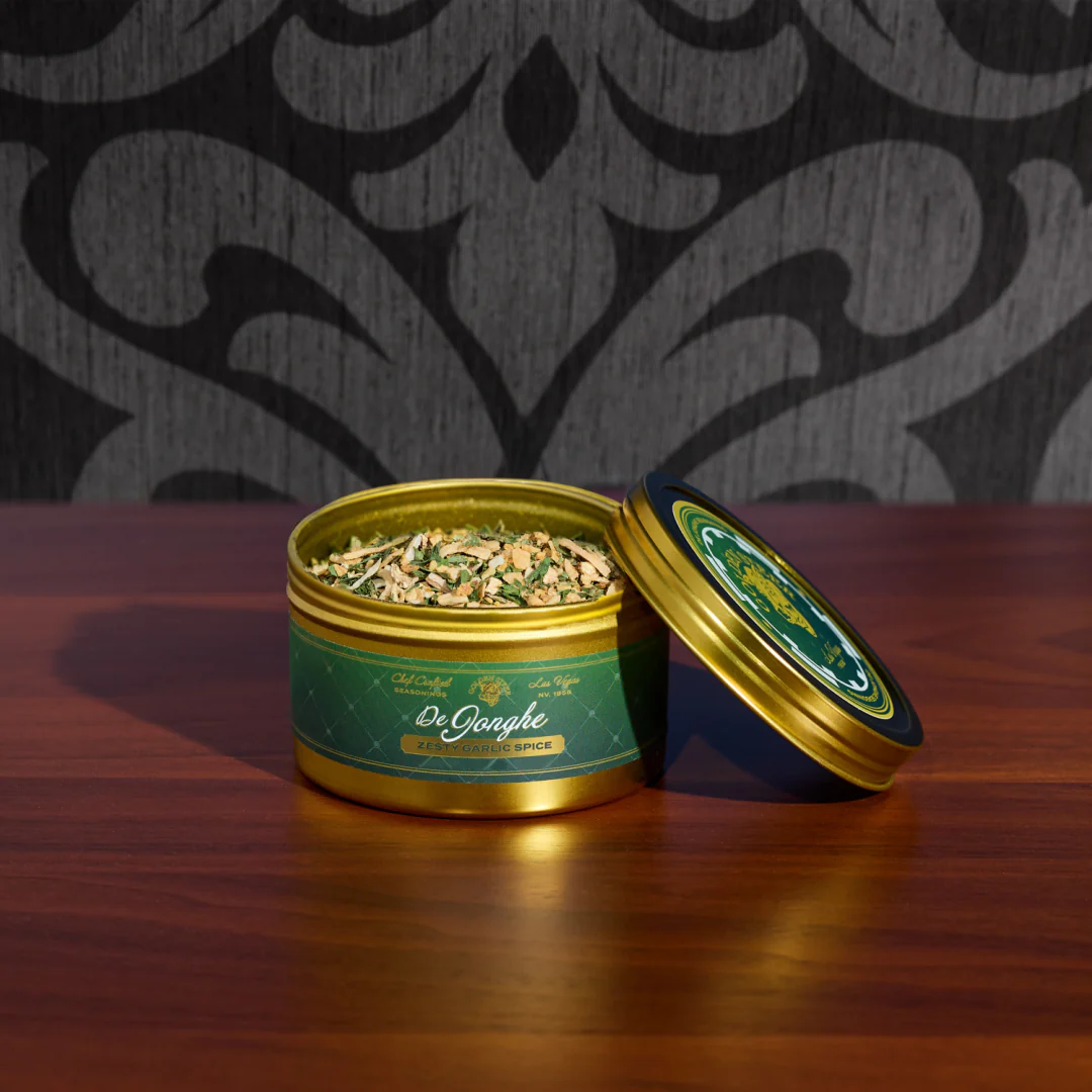 De Jonghe Seasoning is your new go-to garlic seasoning for adding deep flavor to shrimp, chicken, roasted vegetables, or pasta. Featuring bold garlic, tangy lemon, and a blend of chef-selected spices, it enhances every dish. This blend channels the rich, classic flavors of our famous Shrimp De Jonghe recipe, making it easy to recreate the magic of the Golden Steer at home. Each seasoning tin is 2.6 oz (net weight).
